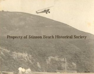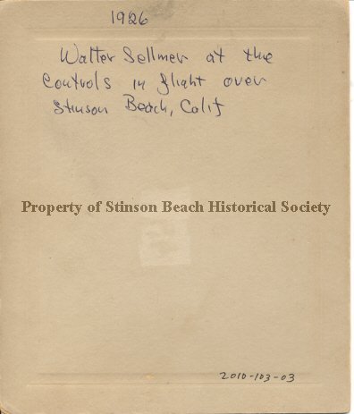 This black and white photograph shows a single winged aeroplane flying in the sky above hills behind the beach. The top of a house and a deck with 4 people looking up to see the plane are visible at the bottom of this photograph. The photograph is mounted on heavy cardboard which is gray and has a darker gray border around the photograph. On its back, the caption reads: 1926, Walter Sellmer at the Controls in Flight over Stinson Beach, Calif.