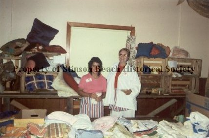 A color photographic print developed from the slide of the corresponding number from Bewley Slide Collection. This photo shows the 1982 Allied Arts Rummage Sale set-up of the Linen Department. Behind the table piled with colorful linen items are the workers, Bonnie Sullivan and Ruth Danielsen, in red, blue, white striped aprons. Several crates of pillows are standing behind them.