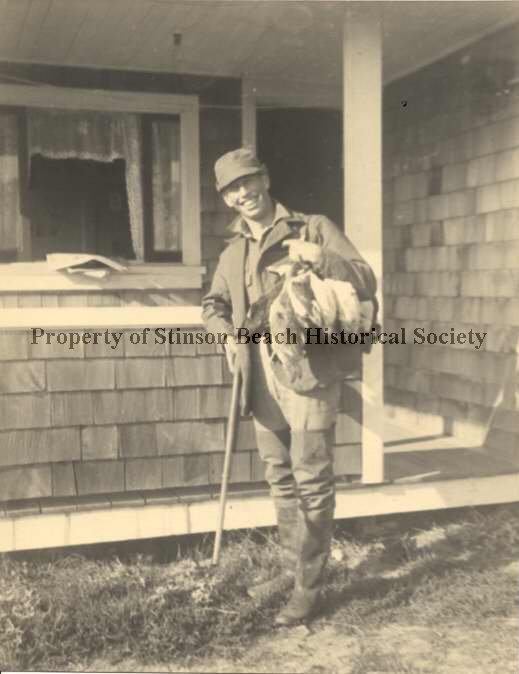 "Pop" Stelling, a smiling middle-aged man, stands in front of a wood shake porch of a house holding his catch of the day (which looks more like rabbit than fish or bird but could be both). In the other hand he holds a long pole-shaped thing, which looks too narrow to be a rifle but... it must have something to do with his catch. He is wearing a fisherman's cap, thigh high rubber boots, and jacket over an open collar shirt. The house he's standing in front of has a window with a lace curtain and a book or newspaper resting on the sill. The house is slightly elevated above the grassy ground.