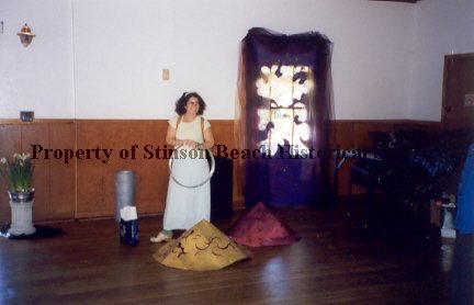 In this color photograph a woman (Heidi Gross Sandeval) in a long white skirt and off-white top, stands holding a hoop in her hand. There are two decorative, cone-shaped lamp shades, one gold and one raspberry, on the floor in front of her. The hoop is probably the framework for a third one. These cones are to be hung, inverted, under the ceiling lights (see 2000-212-01, upper left corner). To the right of Heidi is a draped and decorated door. The walls are bare.