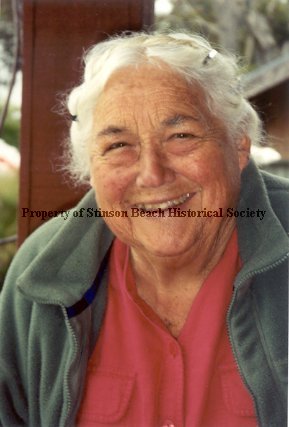 A color photographic print of Nancy Sullivan taken at time of Oral History interview. White haired and ruddy faced lady is smiling. She is wearing a green jacket over a red shirt.