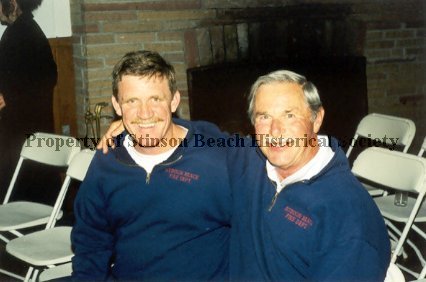 A color photographic print of Kenny Stevens and Kendrick Rand, present and past fire chiefs of Stinson Beach. They are seating in front of the fireplace of the community center. Both are wearing matching navy blue SBVFD swet shirt and Kendrick has his arm around Kenny's shoulder.