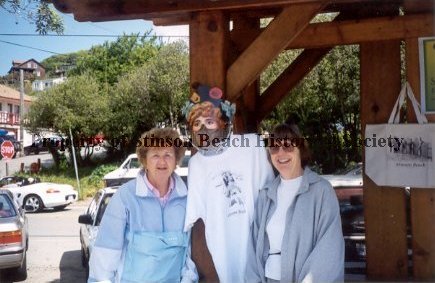 Jane Slack (R) in tinted sunglasses and a lavender jacket over white t-shirt, and Erma Parsons (L) in 2-tone light blue windbreaker flank the t-shirt on display that sports a female face encircled in some sort of hat (see previous photo). Taken at the Historical Society booth on May 9, 1997 Cuisine on the Green.