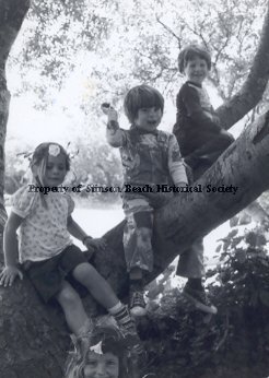 This black and white photo shows three children up in a tree. A girl is sitting sidesaddle on a limb close to the trunk. Next to her, to the right, a boy is straddling the limb and above him farther to the right another boy is perched on a side limb. At the bottom of the picture by the girl's feet is the head of another girl. Both girls have flowers tucked into their hair.