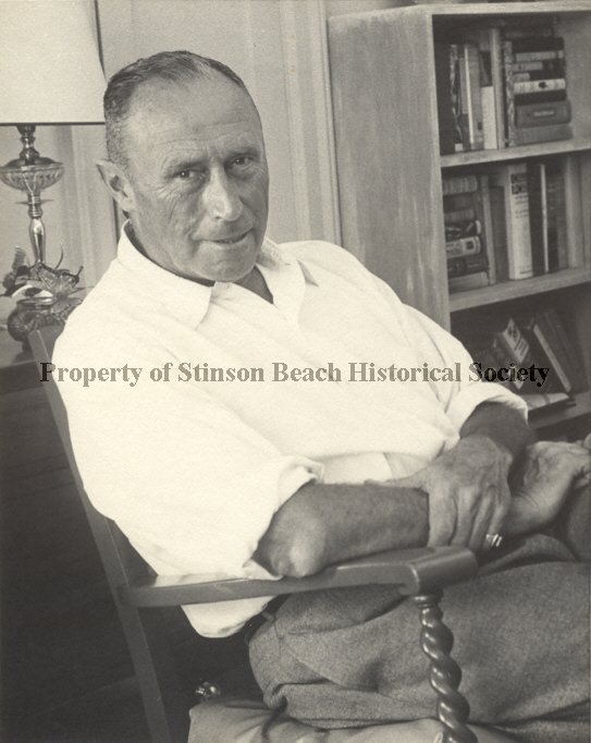 B&W Photo of Ralph Sterner sitting in a straight-back chair in a living room or office. There is a table lamp behind him on a chest of drawers and a bookcase full of book rightside up, tilted and stacked. He is looking directly at the camera. He is wearing a white shirt with the sleeves rolled up past his elbow, wool pants and a pinky ring. His hair, combed straight back, is thinning and changing from dark to white.