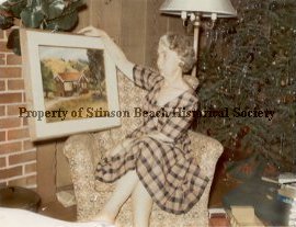 In this color photo of Mildred Sadler she is holding a picture of Stinson Beach School, 1966. The picture was a gift from her husband Lester on the year she retired. She is in front of a fireplace wall in their home. There is a Christmas tree in background.
