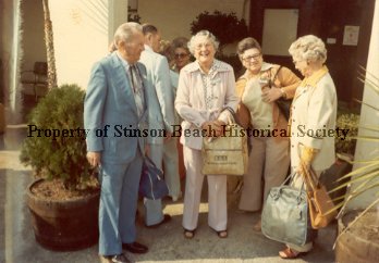 This color photograph shows four people lined up in front of a building. There are potted plants on either side of the people. The man on the left (Lester Sadler) is in a light blue suit. He is holding two small bags in his left hand and is facing right. Next is a woman (Louise Airey) with grey hair and in a light pink pant suit. She has small cream colored tote bag over her left arm. Next to her is a woman (Dorothy Mayfield) with short dark hair and glasses wearing beige slacks and a white shirt with an apricot shirt-jacket over it. She has a dark bag over her left shoulder. Lastly on the extreme right is a woman (Mildred Sadler) facing left. She has grey hair and is wearing a white pants suit over a yellow blouse. She is holding a tan handbag and a silver tote bag in her left hand. There are some unidentified people behind the group. On the back of the photo Louise Airey has written 'left to right Lester Louise Dorothy Mildred I look like Ruth here. We are all wearing our Whistle Stop pins - on our trip to Hawaii'