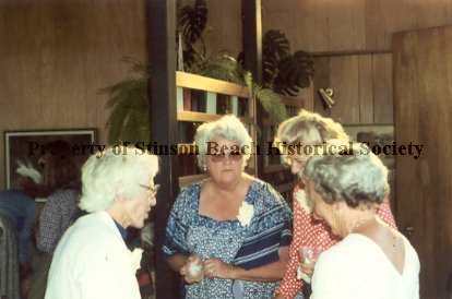 A color photographic print developed from the slide of the corresponding number from Bewley Slide Collection. This photo shows the party for the workers held before the Allied Arts Rummage Sale, 1982, in a home in Seadrift, probably the home of Shirley and Bill Harkness'. This photo shows 4 ladies talking in the hallway adjacent to the Living Room. The ladies are, Ruth Smith, Virginia Bewley, unknown, and Gretel Philipps.