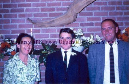 A smiling Sherfy family (L. to R. Barbara, Greg and Bill) stands in front of brick fireplace. Barbara wears a blue & green floral print dress, son Greg is in dark suit and tie, Bill in a blue suit and dark tie. This is similar to previous photo (1996-221-01) in which they are more serious.