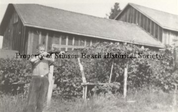 This is a black and white photograph of a man standing in front of a tangle of blackberry vines aiming a rifle. Behind the vines is a large structure. The man is Hoyt Sherman and he is standing in front of Airey's barn, across from the store.