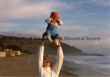 A smiling open-mouthed Patricia Scott holds (or is tossing into the air) baby Owen, dressed in blue and white jumper, booties and red cap. They are on a south-facing Stinson Beach with the surf on the right, the castle house plus a few others visible on the left,
