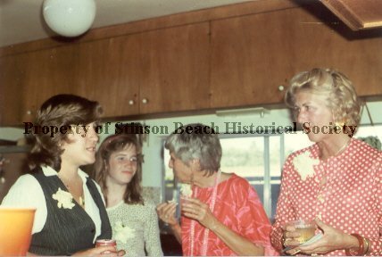 A color photographic print developed from the slide of the corresponding number from Bewley Slide Collection. This photo shows the party for the workers held before the 1982 Allied Arts Rummage Sale in a home in Seadrift, probably the home of Shirley and Bill Harkness. Two young sisters, Lisa Smith and Cricket Smith, are talking to Shirley Harkness. An unknown lady is at their right.