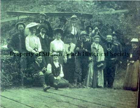Xerox copy from slide of a group of travelers standing (plus a couple sitting) in front of the Willow Camp buggy (sign on buggy is slightly visible) boarding site. Ladies are mostly in broad brimmed hats and long dresses. Men are variously and casually attired, mostly in hats. One trickster holds a water bottle over the head of female in long coat.