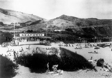 This black and white photograph is of a long building perched on top of a dune. There is a large sign on the roof with SEADOWNS written on it. To the right, also atop the dune, are 3 small cottages. There are people and umbrellas all over the sand around and in front of the building. There are some large, dark patches of vegetation in the middle of the sand. Hills are visible rising behind the dune and buildings.