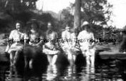 This black and white photograph is of five ladies sitting on a low wall dangling their feet into a pool below. All are wearing dresses. Three are bareheaded and two wear brimmed hats. They are all looking at the camera and smiling. There are trees in the background