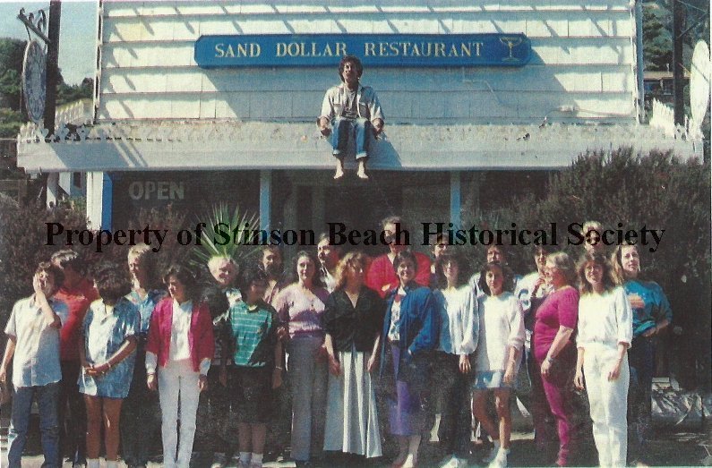 The staff of the Sand Dollar restaurant is assembled in front for a group photo. Elliott Kolker oversees the production from atop the porch overhang. Standing (l to r) in front row: Aaron Jarvis, unidentified girl, Wendy DiPaolo, unidentified boy, Andrea di Marco, Karen Garrett, Rhonda (Freeman?), Tommye Jarvis, Sandy DiPaolo, Daisy Denton, Katie Pierce. Back row (l to r): Kendrick Rand, Andrea Schecter, Barbara Nepil, Jack Nepil, Mark White, Steve Johnson, Lori Gould, Ellie Wickholm, Robin Algren, Dude Denton, Carlin Bowman.