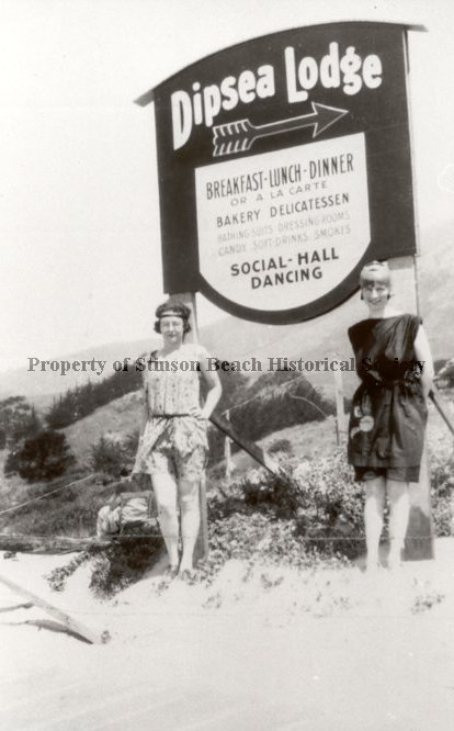 In this black and white photograph two women are standing in front of a sign saying 'Dipsea Lodge' with an arrow underneath pointing to the right. Underneath the arrow is written: BREAKFAST-LUNCH-DINNER