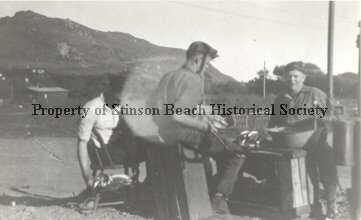 A black and white original photo of 3 men cleaning fish at make shift table and chair made up of wooden crate boxes. The man facing toward camera could be Frenchy Gales, and young man in front is possibly Hal Airey. The well stands right of the photo where a large bowl is placed to collect water. The hillside cottages and Anchorage building can be seen in the background at the base of hill.