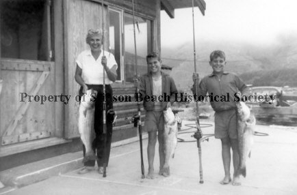In this black and white photograph a woman and two boys stand on a cement patio by a log house with a dutch door. The three of them are holding fishing poles and large fish. The fish are striped bass and range in size from about 18 inches to 26 inches long. The people are, from left to right, Adelaide, Mark and Craig.