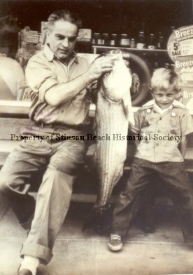 In this black and white photograph a man in a shirt with rolled up sleeves is sitting on a bench holding up a large fish. Next to him is a little boy in keds and a short sleeve shirt. Behind them are dry goods and some bottles and jars on a shelf. The man is Alfred Pierre "Frenchy" Gales, the boy is his step-grandson, Michael Griffin, and the fish is a striped bass.