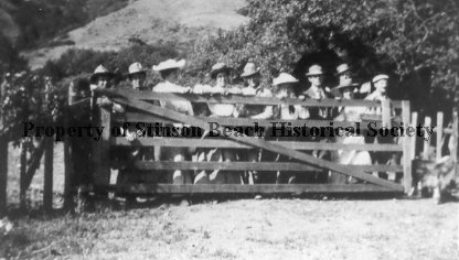 A black and white photographic reproduction was made from the original of Maybelle Kelly. The photograph shows a group of 10 hikers lined up on the far side of a large gate, perhaps a cattle gate. The gate is situated at the bottom of the hill near present community center. Six men and 4 women are dressed in Victorian-style hats and/or dresses. A sheep dog is at the opening of the fence.