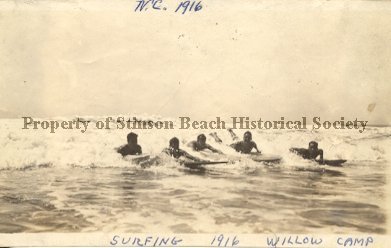 Photograph of 5 people on surfboards. They appear to be young men and the foam of the wave indicates they are close to shore at the end of their ride. This is the original print.