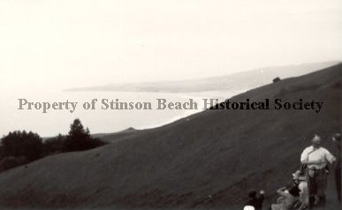 A black and white photograph of a hiker's first view of ocean when hiking from Mill Valley on Dipsea Trail. Shows Stinson Beach and Bolinas in background, the hills and the trail with people (Bibbens and Dunn families) in the lower right hand corner.