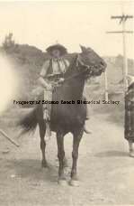 Man in cowboy gear rides a dark horse along a populated road judging by the telephone poles visibile.