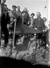 There are at least thirteen people in this black and white group photograph. They are standing on a rocky outcrop displaying a banner reading 'NOMADS'. The subjects are all men, many wearing hats, and all in rugged clothes. They are probably members of a hiking club.