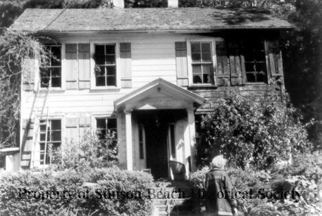 This black and white photograph is a full frontal view of Easkoot House. It shows the charred right upper corner of the house with the window completely burnt out. There are also missing panes on the other three upper windows across the front and blackening under the eave above the uper left hand window where a ladder leans. A man stands at the bottome of the steps with his back to the camera, viewing the damage.
