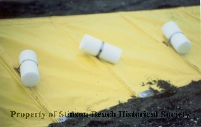 A color photographic print made from a slide showing a floating barrier boom detail. It looks like a yellow canvas material on which floating devices are attached at intervals.
