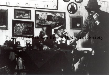 Black and white photo of a scene from the play "Mysterious Doings in Rinso Bleach", subtitled "Gossip's Gonna Getcha If You Don't Watch Out," by John Grissim. The scene shows inside of an establishment similar to the "Seawitch" restaurant, which used to occupy one of the spaces in the Post Office Complex. On the back wall several framed paintings hang. Around one of the tables, two men sit drinking or eating while another man (Justin Sanford) in a striped suit and brimmed hat stands and talks on a phone. A phone book is open on the table in front of him. In the center Chris Lewis sits drinking a beer, wearing Oakland A's hat. The side view of Jay Kinberger as other patron is seated in back against the wall.