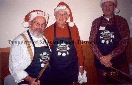 A color photograph of three men at the Holiday Luncheon: Douglas Schmidt and Denis Parsons, the chefs, and Joe Fitzpatrick, the elf waiter. All regularly volunteer at the yearly occasion.