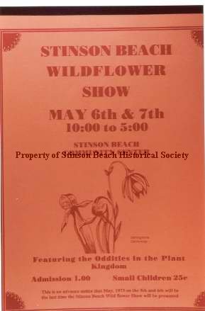 A color photograph of the Stinson Beach Wild Flower Show poster. It announces the show to be held on May 6 and 7(1972) from 10-5pm at the community center. The featured the Oddities in the Plant Kingdom. A drawing illustration of Darlingtonia California is shown. Admission is 1:00, small children 25c. It also announces, an advance notice that May 5th and 6th of 1973 will be the last Wild Flower Show at Stinson Beach. The wild flower show were moved to Oakland Museum. See also 2006-100 to 113 and the original poster in the Archival Collection.