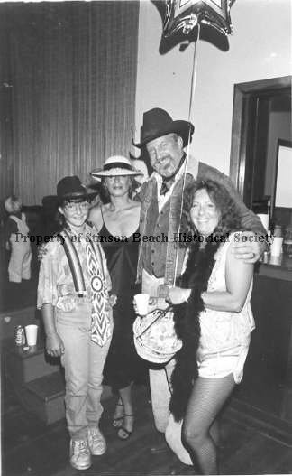 Doc Flynn with arms around his lady friends: Karen Garrett (R) in shorts, net stockings and boa; a lovely unidentified lady in low-cut silk dress and white hat with veil; and a youngster wearing glasses in black cowboy hat, trousers with rainbow suspenders and psychedelic necktie