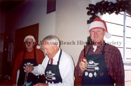 A color photograph of Parsons, Denis/Engel, Al/Fitzpatrick, Joe at 2007 SBHS Holiday Luncheon. Al is serving pre-luncheon punch. Denis is watching Al, and Joe stands with the candle lighter. All are wearing the SBHS aprons. Denis and Joe are also wearing Santa hats.