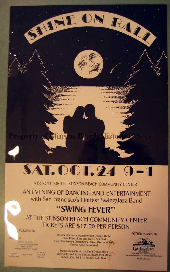 A poster printed on 81/2" x 14" black on beige paper announcing an evening of dance and entertainment at the community center hall for the fundraising. The event was held on Oct 24, 1991. The event was named "Shine on Ball, Swing Fever". San Francisco's hottest swing/jazz band was featured and $17.50 was charge at the door.
