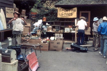 A color photographic print developed from the slide of the corresponding number from Bewley Slide Collection. This photo shows the 1982 Allied Arts Rummage Sale set-up of the Sporting Goods Department. It was set up on the driveway in front of the present Historical Society Archival Room, which at the time was the storage room for the Community Center Inc. It shows volunteers setting up or selling the items. The shelves made of crates are 1/2 empty. There is a yellow "Sporting Goods" banner hanging from the eave of the storage room. A similar sign on the chapel basement wall reads, "BARGAIN BALCONY, a few steps up to save a lot." Furniture Department items visible on the left include a card table, cat carrier, folding canvas chair, ironing boards. The salesman, John Rusk, is about to put on his apron with JOHN printed on it. The Sporting Goods Department has wooden crutches, a gas can, ice skating shoes, and balls and hats among other boxed items. The "salesman" standing with his back to the camera is Bill Harkness. Two other men in hats stands by.