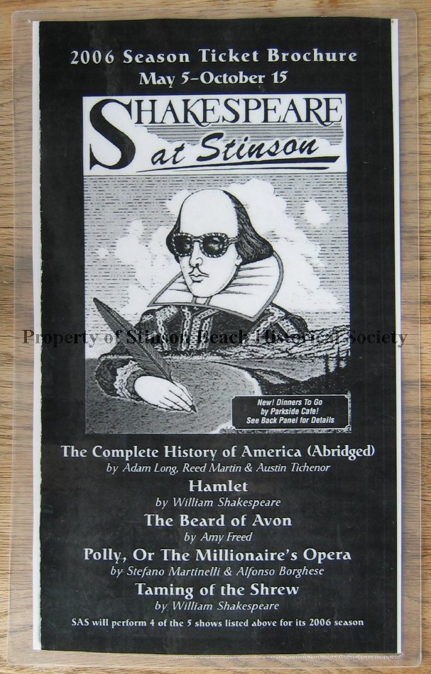 A black and white poster announcing 2006 Season Ticket Brochure for Shakespeare at Stinson. The 2006 Season, May 5 to October 15 included, "The Complete History of America (Abridged)," "Hamlet," "The Beard of Avon," "Polly, Or The Millionaire's Opera" and "Taming of the Shrew," At the bottom of the poster, there is a quote, "SAS will perform 4 out of the 5 shows listed above for its 2006 season." SAS was started by Jeffery Trotter, a resident of Stinson Beach. He spent much of his money and time in this endeavor which had many ups and downs due to the location of the outdoor theater, next to the Post Office, Library and the Easkoot Creek; the Village Association and the Marin County Planing Department were not friendly to him. However, SAS stayed on to entertain people of the town and visitors for over 10 years until it moved to the Novato Fairground in 2007. Shakespeare at Stinson's first few years were performed in the garden of Barbara Chevalier, below the junction of Panoramic Highway and Highway 1.
