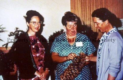 Three Wildflower Ladies are discussing cone of sugar-cone pine. They are standing in front of a display of conifers. It is a color photographic print. Anne Leary at left is wearing a reddish dress with black sweater. Roberta Shockey is at the center holding the large sugar-cone and examining the pine-nut, probably. She is wearing a bright green with white polka-dots summer dress. Barbara Menzies (Sherfey) is standing to right wearing a blue and white dress with light blue sweater. Gold drapery is hanging on the right hand wall.