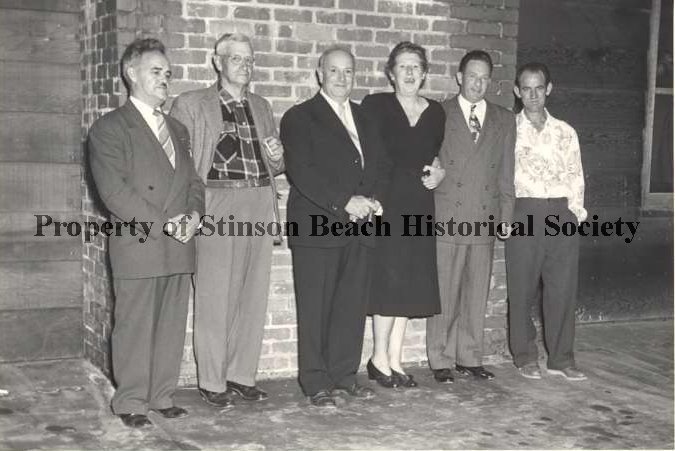 This original black and white photographic print shows six people standing in front of what appears to be the back side of the fireplace at the community center. The people are from left to right Chancey Jaques, ____ Johnson, Joe Bordanaro, Lillian Russell, Lester Sadler and Henry Lacaze.