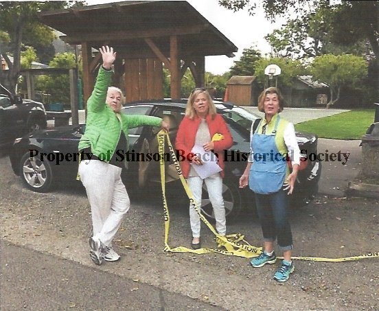 Three women stand in the road in front of Village Green I (L ro R): Sandra Francis with one arm raised in greeting and the other resting on the open car door behind her while holding on to a long yellow caution tape . She is wearing a lime green quilted jacket and white trousers and tennis shoes with one leg is crossed in front of the other. Wendy Di Paolo (center) has on a red jacket over light colored jeans and shirt and black flats. She is holding some papers in her hands and something yellow in the crook of her arm. Ginny Otis, with her arms at her side, wears a blue apron over her chartreuse vest and white shirt with slight rolled up jeans and blue tennies. In addition to the black car behind them, the wooden bus shelter is visible and an empty Village Green basketball court & lawn. Presumably this is prior to Cuisine set up.