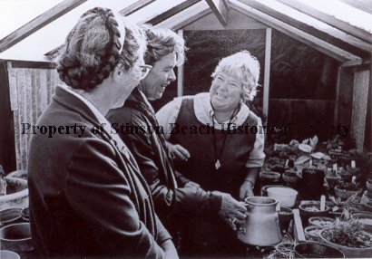 The famed 3 wildflower ladies are conversing inside of a small family hot-house. Flower seedlings are in pots around them. Smiling Roberta Shockey is facing camera, Barbara Menzies (Sherfey) who stands in center and Anne Leary with her braided hair are seen in smiling profiles. Photo was taken in 1971.
