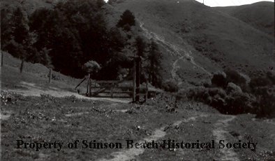 A double dirt track trail runs along the base of and towards a hillside. Slightly higher on the left, separated by weedy growth, is another wider path that has an open swing-type gate across it and wire fencing extending uphill from it. Trees and brush grow at the base of the hill.
