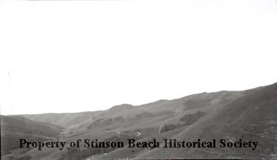 Rolling, sloping hills with copses of trees scattered in the clefts the hills as they slope downward. The view is of Windy Gap from the road below looking up. The base of the hills are known as Frank's Valley.