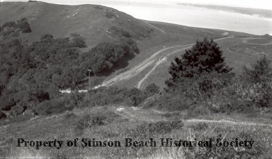 Trail is marked by ruts in the hillside as it extends overland and across the broad terrain. Area is known as Devil's Slide as the trail in the foreground descends steeply before is rises again on the opposite hillside. There are patchs of trees extending from the left to right on otherwise bare hills, except for a lone telephone pole near the base. Bolinas Bay can be seen in the distance.