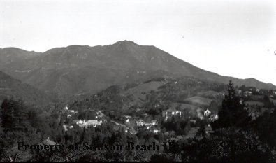 View of Mt. Tamalpais from Inspiration Point in Mill Valley shows a number of houses interspersed among the trees on the lower mountainside and a clear sky.