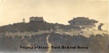 In this black and white photo the railroad track, cut into a ridge, stretches across the entire picture. At the far right is a portion of the white station building. To the left, at the top of the ridge are two dark buildings. The larger one, close to the stationhouse, has a multilevel roof and many windows. Farther to the left and at the top of the ridge is a smaller building with just two windows. There is a small unidentified structure to the left of that.