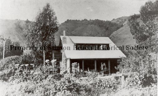 A black and white photo depicting a cottage with a deep overhang running the length of the house and dormer windows running almost the length of the roof. There is an outside staircase on the left of the house leading up to the attic with the windows. There is also a stone chimney on the left side of the house. The cottage is surrounded by shrubs and plants with trees on either side. There are hills in the background.