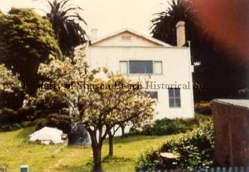 Rear view of a white 2-story house and lawn area with two flowering trees and low shrubs. There are larger trees, including a palm on the far side of the house. The house has one long window on the upper floor. Only one smaller window is visible beneath it, the other window(s) are obscured by the flowering trees. This is the Lawrence family home which is located on Shoreline Highway north of Barbara Chevalier's residence.
